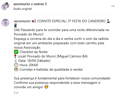 No dia 18/04/26 irá acontecer a 3ª edição da festa do candeeiro. Em participação na Rádio Comunitária Canabrava FM 87,9, Márcia Barbosa e Silvana Pereira falaram sobre os preparativos para a tradicional Festa do Candeeiro, que será realizada no povoado do Murici, em Miguel Calmon.