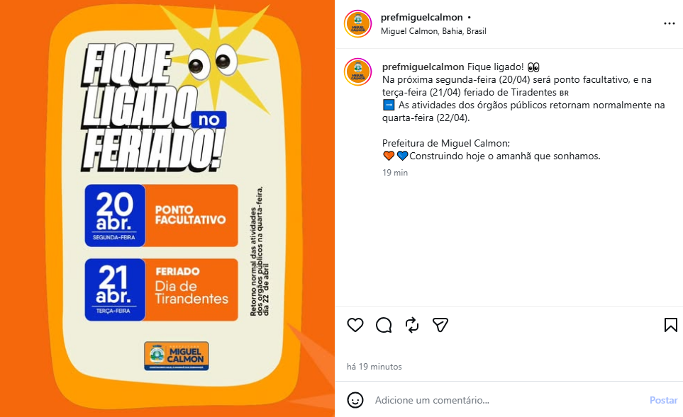 A Prefeitura de Miguel Calmon informou que o salário referente ao mês de abril já foi depositado nas contas dos servidores municipais. A medida garante que os trabalhadores iniciem o feriado prolongado com os vencimentos disponíveis, contribuindo para a organização financeira das famílias e aquecimento da economia local.